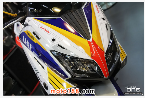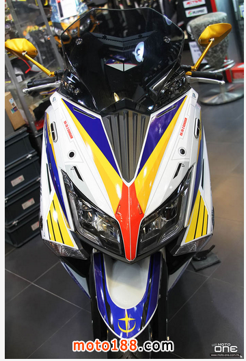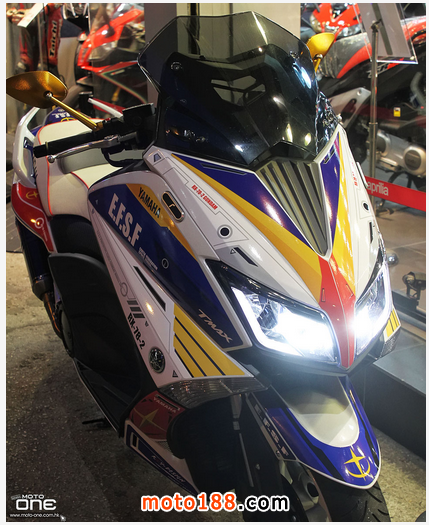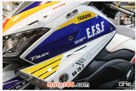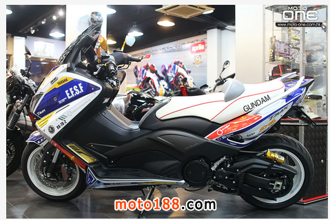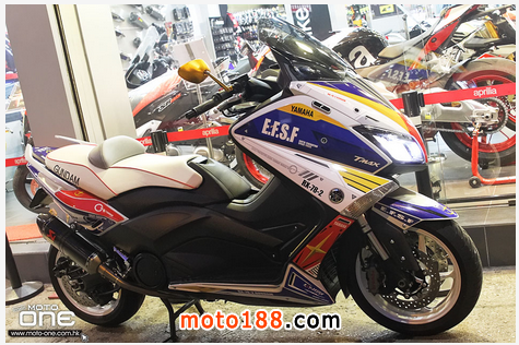 在本年初的一次活動中已經被這臺高達貼紙拉花的新款2015 T-MAX 530吸引,可惜當時忙於拍攝活動,忘記拍攝車身細節。今天,在亞林的陳列室再度看見,當然要把握機會成功捕獲野生「高達」2015 T-MAX 530。